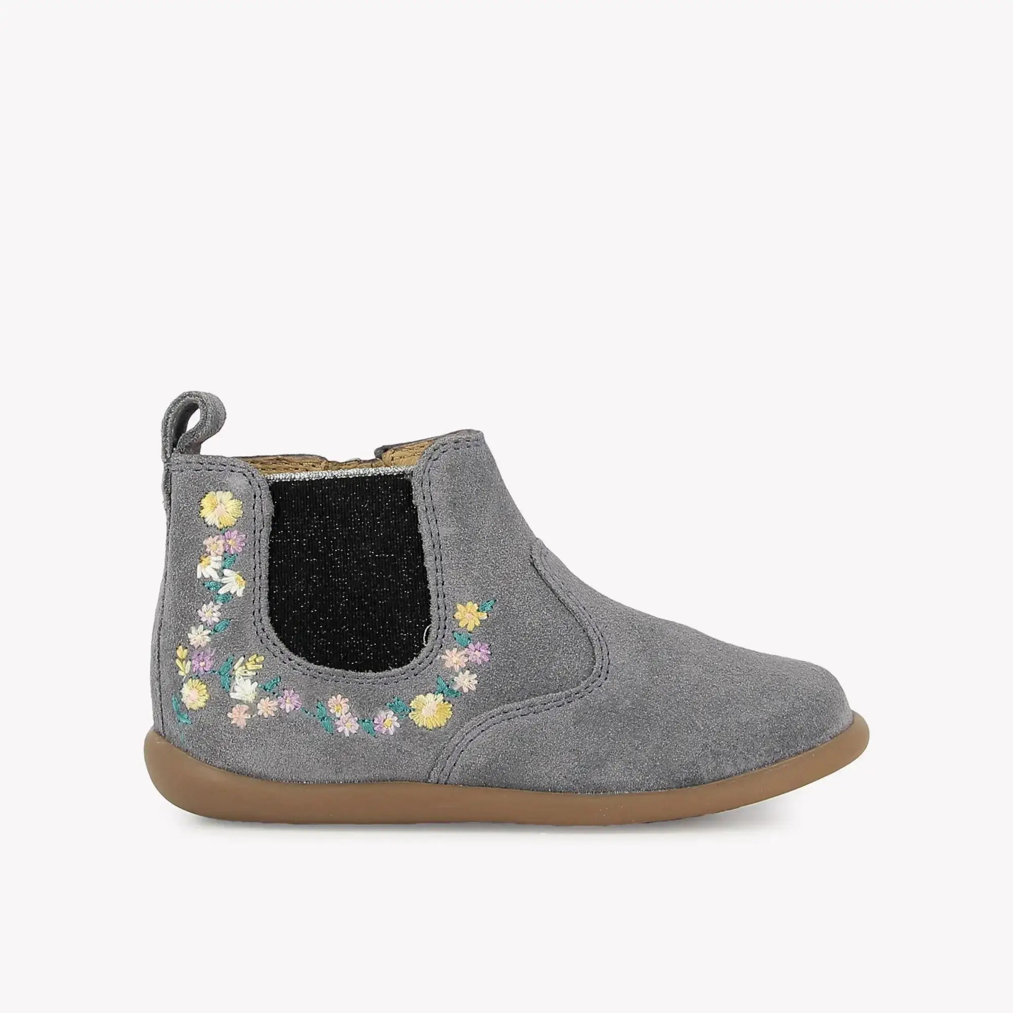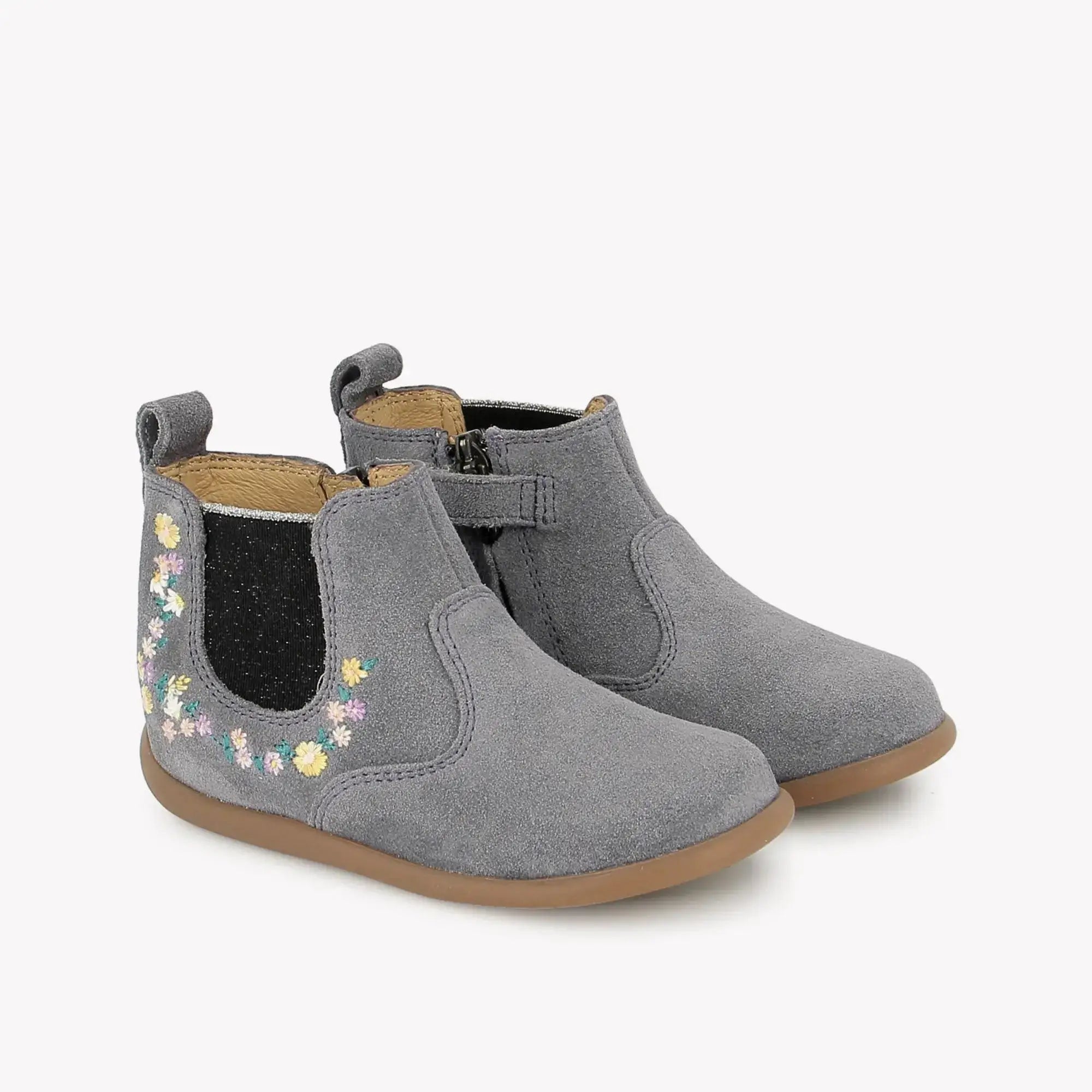 This first-step bootie is presented in purple suede leather with embroidered details. It features an inner zip with elastic for easy slip-on. It features a patented Anti-Twist© shank integrated into the sole at heel level.