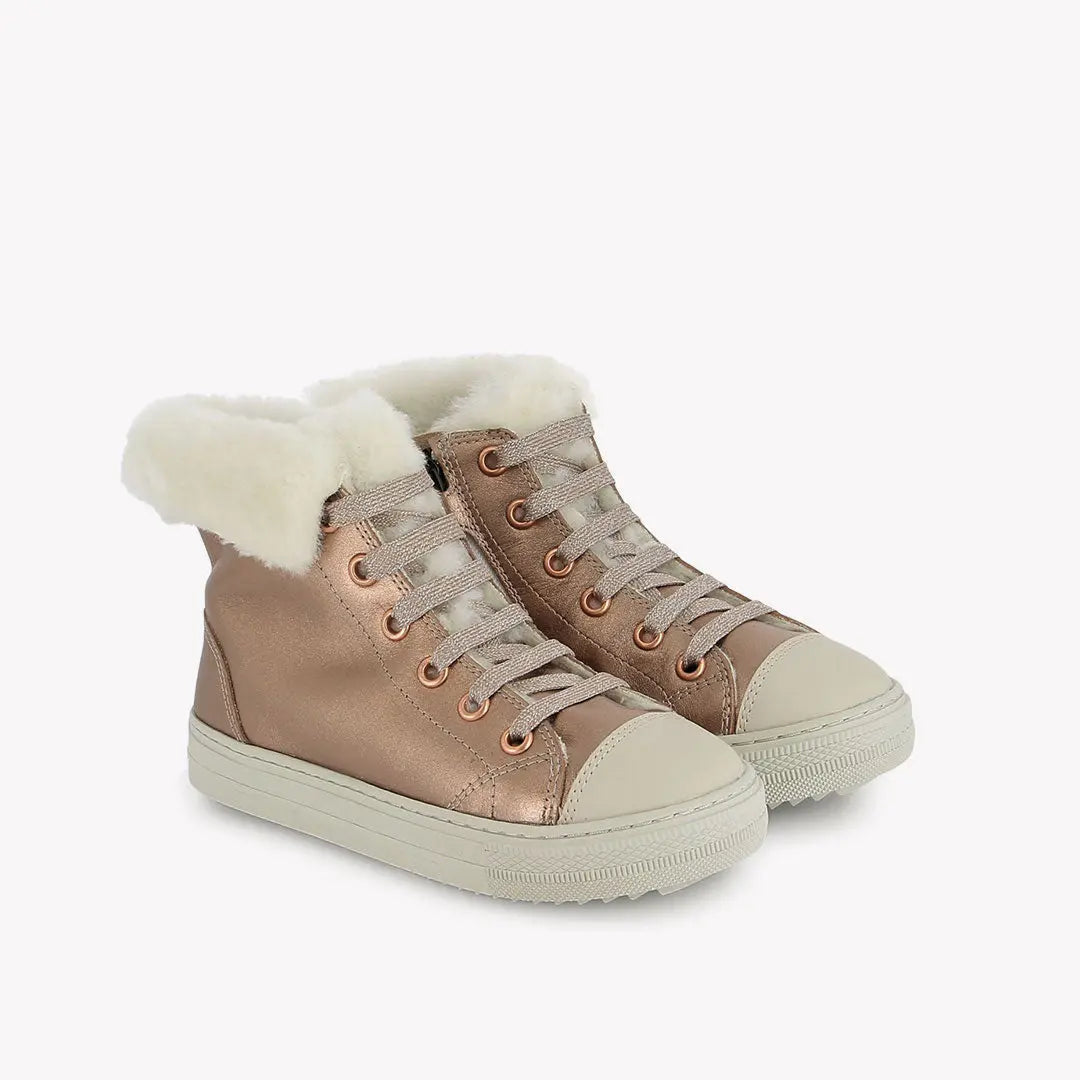 Crafted in smooth metallic leather, this sneaker features a lace-up closure and inside zip for easy slip-on. Its synthetic lining provides softness and comfort. The front is protected by a sturdy cap for added resistance. A leather insole guarantees softness and hygiene. Available in an elegant metallic brown color, they are a must-have for everyday wear.