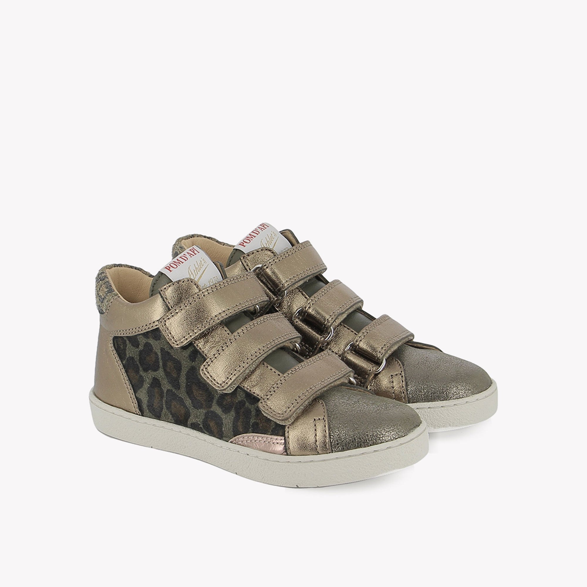 This sneaker from the Athlet's Pom d'Api range combines a harmonious mix of smooth metallic leather and leopard print leather. It features hook-and-loop fastenings for easy slip-on and secure fit.