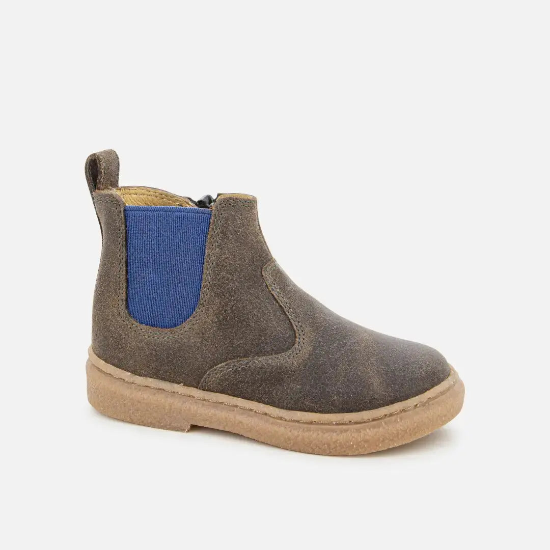 This children's bootie is presented in a taupe suede leather version, with blue elastic. Lightweight and supple, they are designed with quality materials to support the development of the foot. This shoe has a high upper for optimum ankle and instep support, and is easy to put on thanks to its elastic band.