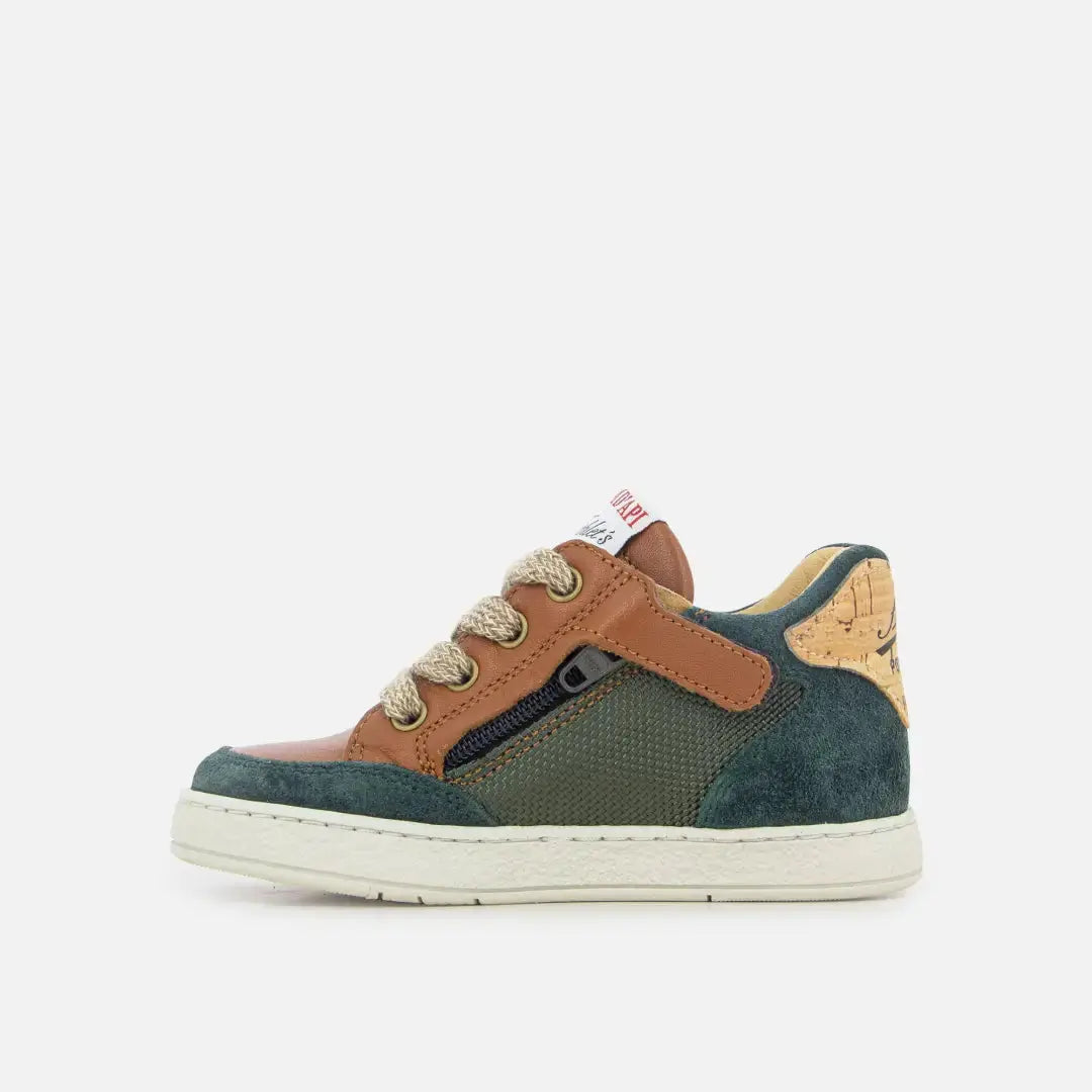 Deze instapper is verkrijgbaar in een tweematerialenversie van kaki textiel, donkergroen suèdeleer en glad camelkleurig leer. Deze soepele, lichtgewicht schoen is gemaakt van kwaliteitsmaterialen om de ontwikkeling van de voet te ondersteunen. Hij is gemakkelijk aan te passen aan de enkel en wreef dankzij de veters en de ritssluiting aan de binnenkant.