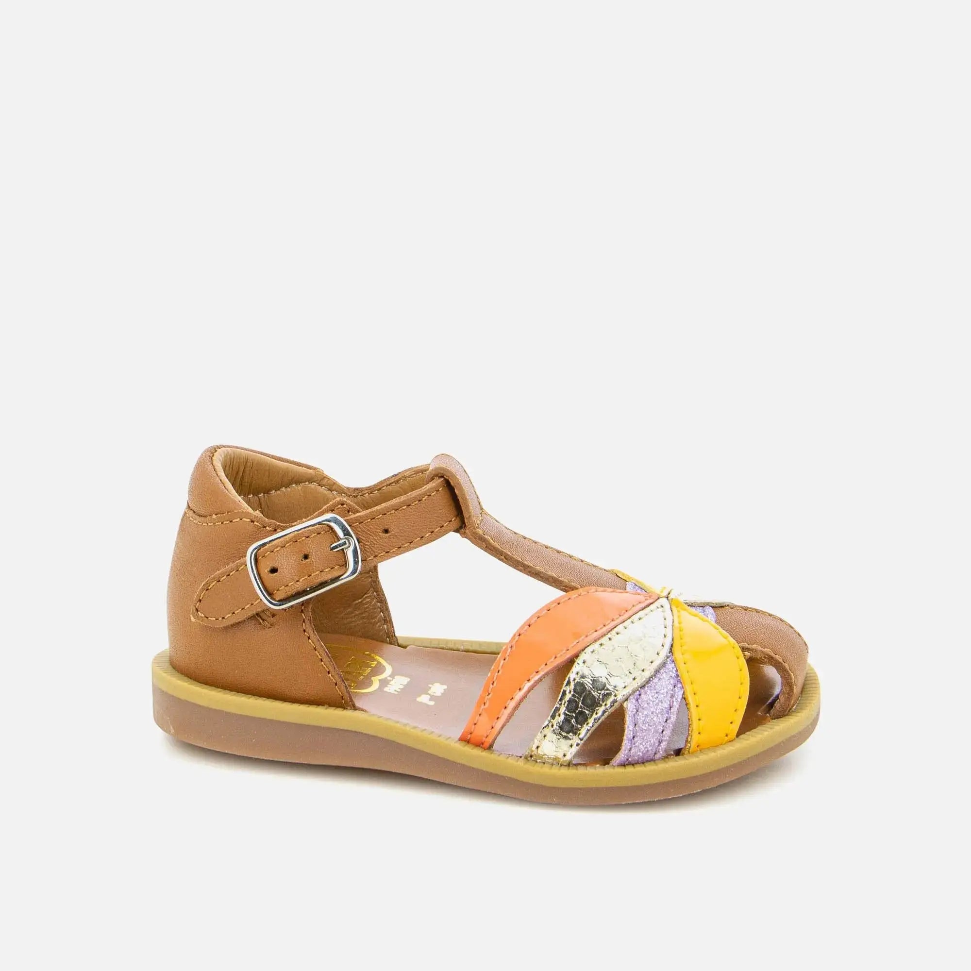 Poppy Oto is een sandaal voor kinderen, hier gepresenteerd in een camelkleurige en veelkleurige leren versie. Lichtgewicht, met een flexibele zool om de voet soepel te laten bewegen en een hoog bovenwerk voor een goede ondersteuning van de enkels. Gemakkelijk verstelbaar dankzij de gesp, past hij zowel bij dunne als sterke enkels.