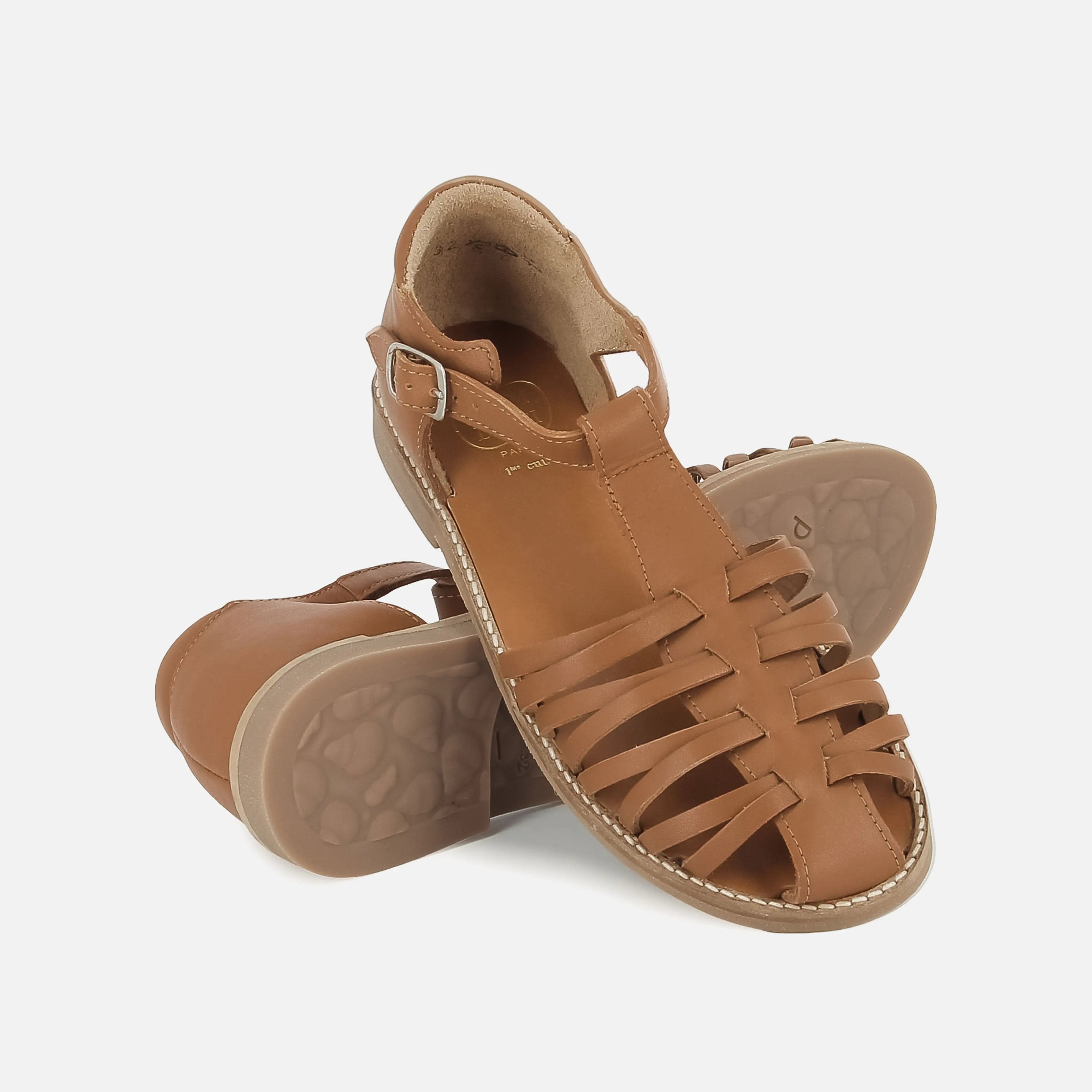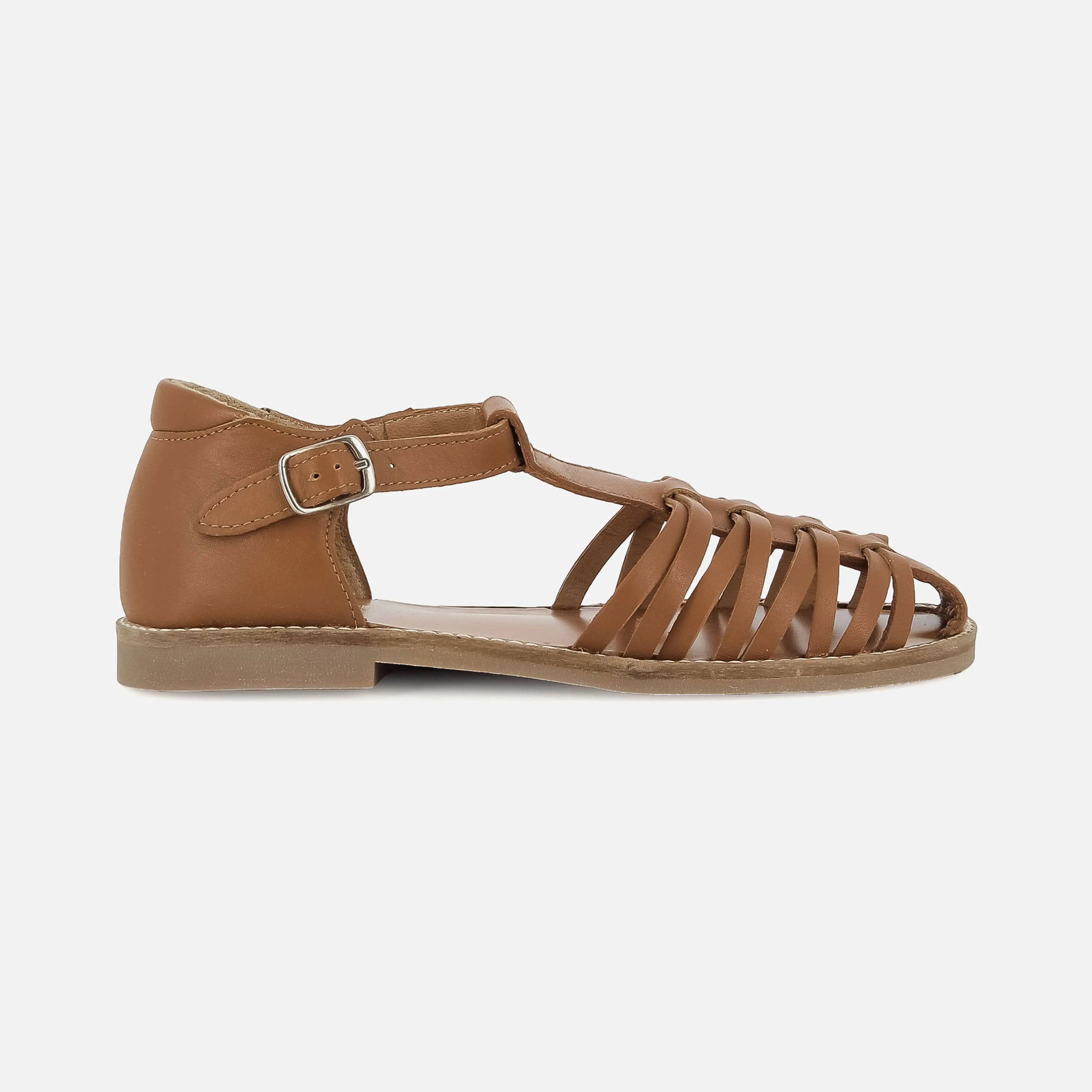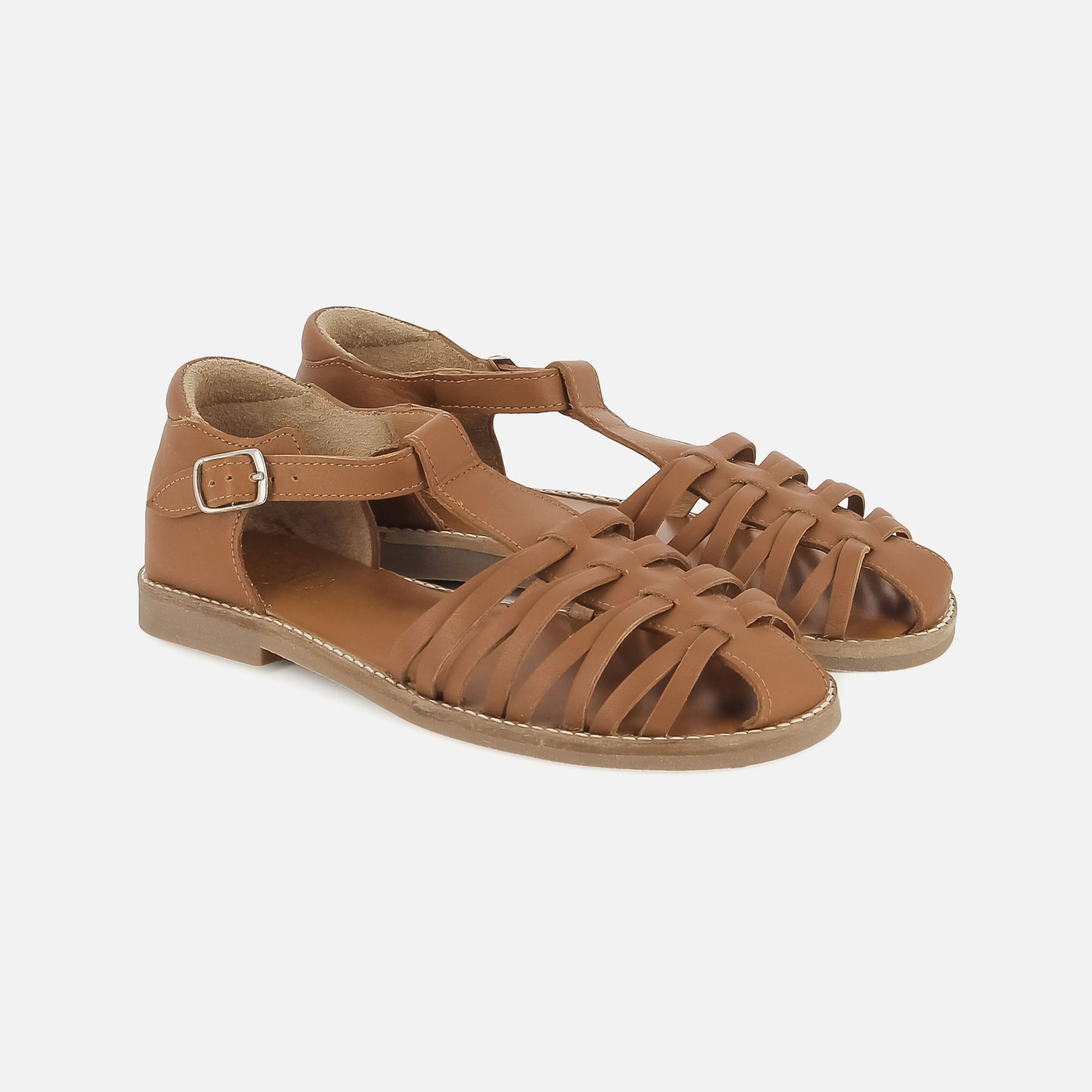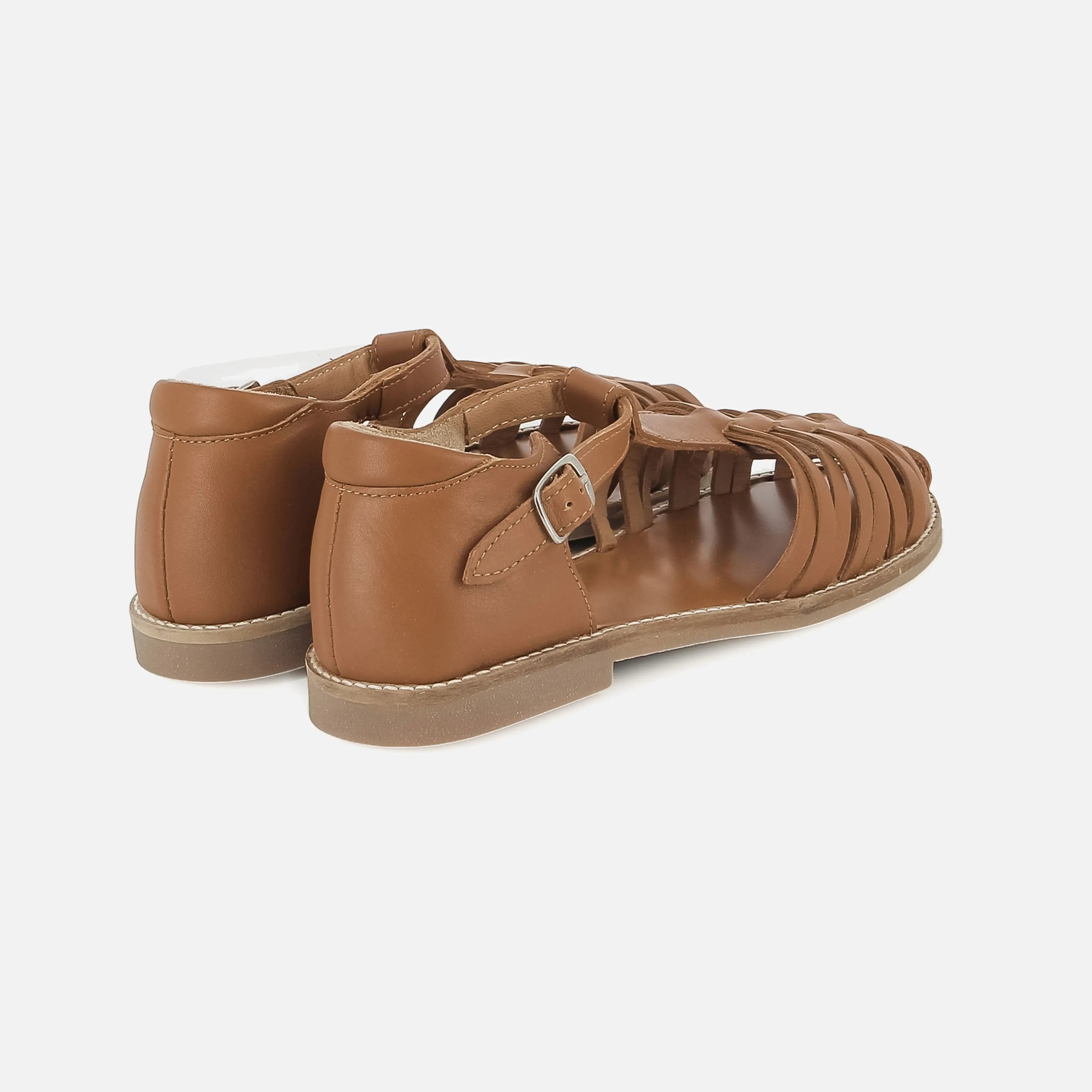 Deze sandaal met verstrengelde bandjes voor kinderen wordt gepresenteerd in een gladde camelkleurige leren uitvoering. Deze soepele, lichtgewicht schoen is gemaakt van kwaliteitsmaterialen om de ontwikkeling van de voet te ondersteunen. Hij is eenvoudig aan te passen aan de enkel dankzij de verstelbare gesp.