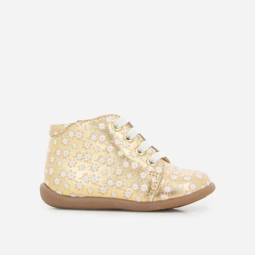 Deze veterschoen voor kinderen is uitgevoerd in goud metallic leer met bloemenprint. Lichtgewicht en met een rubberen zool is deze schoen gemaakt van kwaliteitsmaterialen om de ontwikkeling van de voet te ondersteunen. Een Anti-Twist-versteviging aan de achterkant van de schoen zorgt voor optimale ondersteuning en stabiliteit, terwijl het aan de voorkant van de voet flexibiliteit biedt.