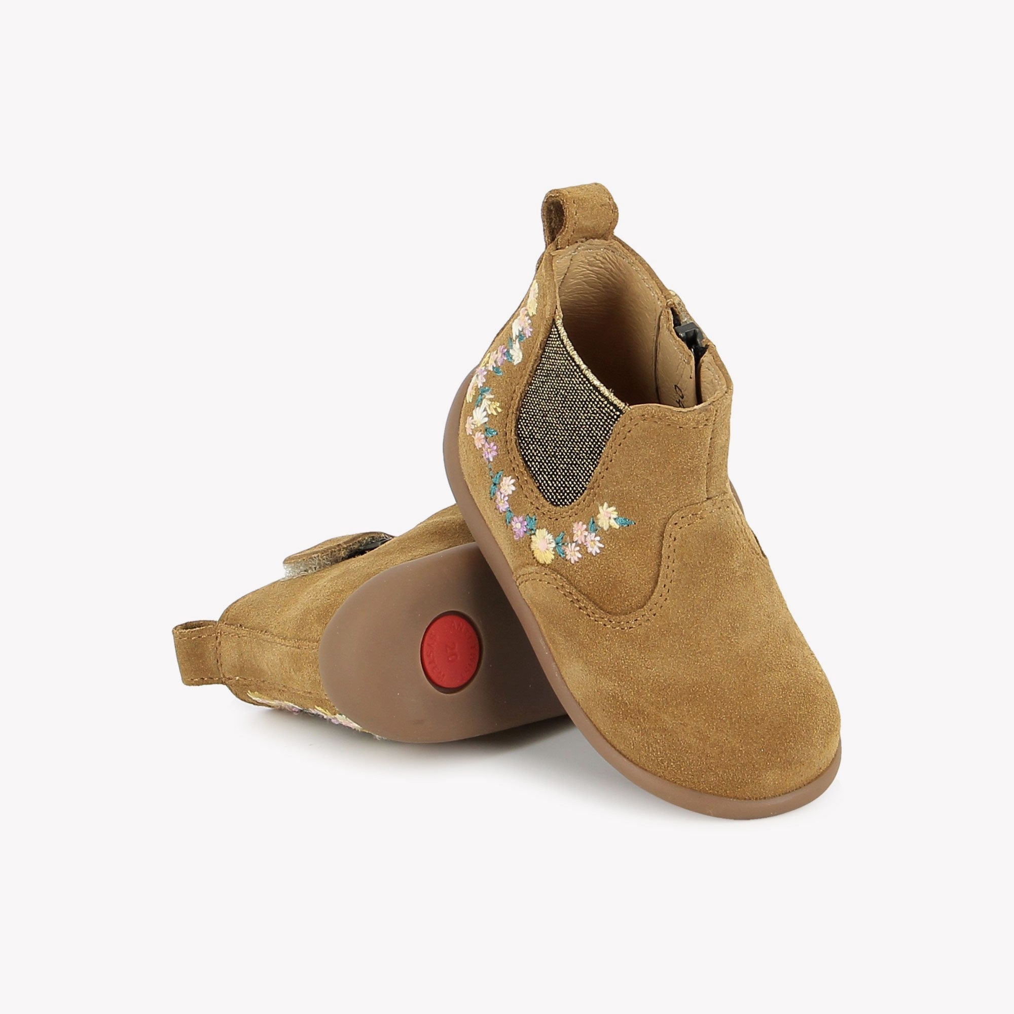 Dit enkellaarsje is uitgevoerd in camelkleurig suède met geborduurde details. Hij heeft een ritssluiting met elastiek aan de binnenkant om hem gemakkelijk aan te trekken. Het heeft een gepatenteerde Anti-Twist© steunzool die ter hoogte van de hiel in de zool is geïntegreerd. Dit systeem voorkomt verdraaiing van de enkel en houdt de voorvoet soepel.