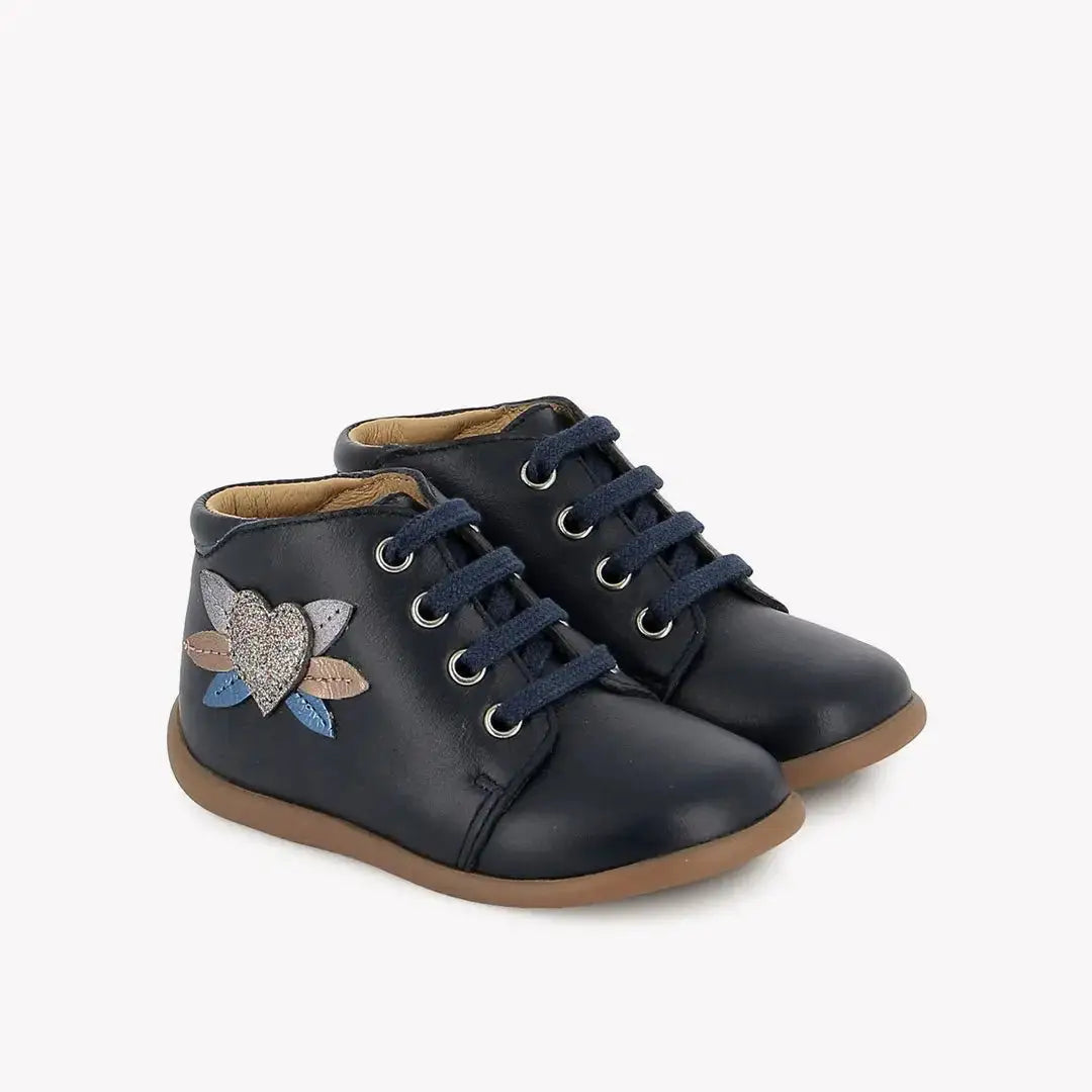 Dit model is gemaakt van glad leer en is gemakkelijk aan te passen dankzij een vetersluiting. Het heeft een leren binnenzool voor extra zachtheid en hygiëne. De rubberen zool heeft een schacht bij de hiel. Deze versteviging voorkomt verdraaiing van de enkel en wreef dankzij het door Pom d'Api gepatenteerde Anti-Twist© systeem. Met zijn blauwe kleur is hij onmisbaar voor elke dag.