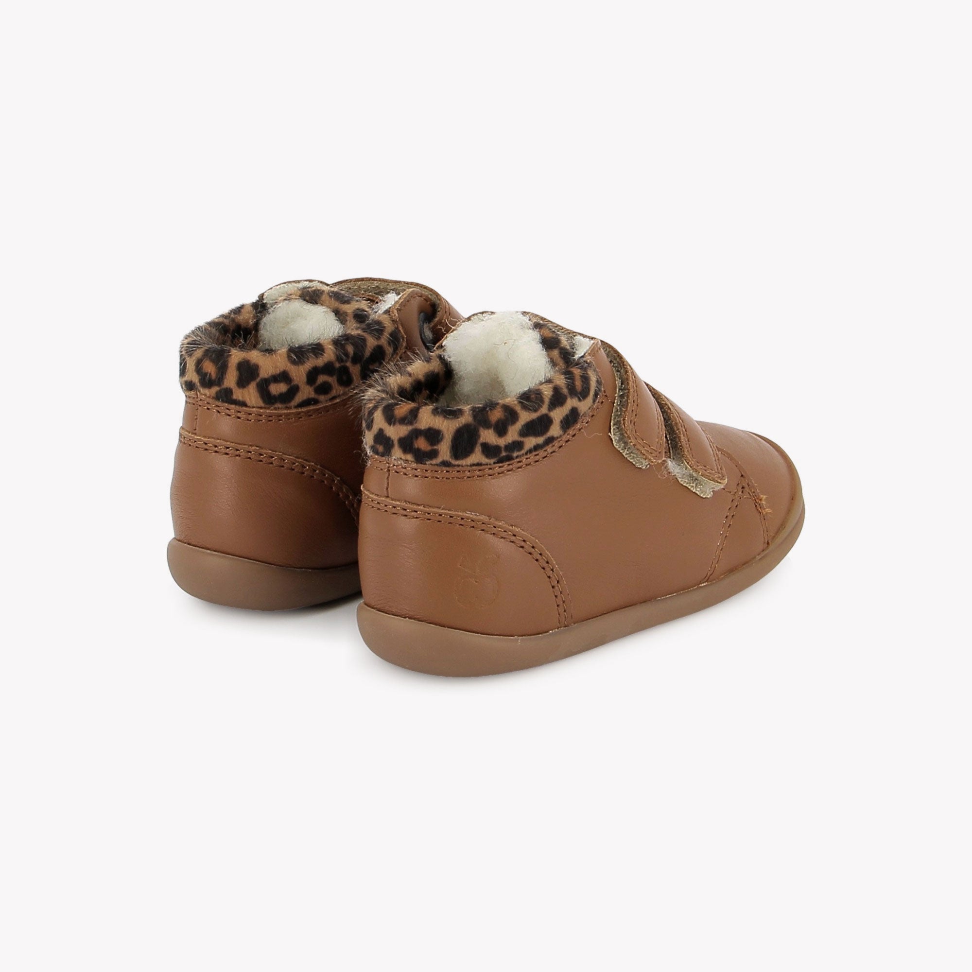 Deze instapper is gemaakt van glad bruin leer en is gemakkelijk aan te passen dankzij de klittenbandsluiting. Hij heeft een textielen binnenzool voor extra zachtheid en hygiëne. De rubberen zool heeft een hielschacht. Deze versteviging voorkomt verdraaiing van de enkel en wreef dankzij een Anti-Twist© systeem gepatenteerd door Pom d'Api.