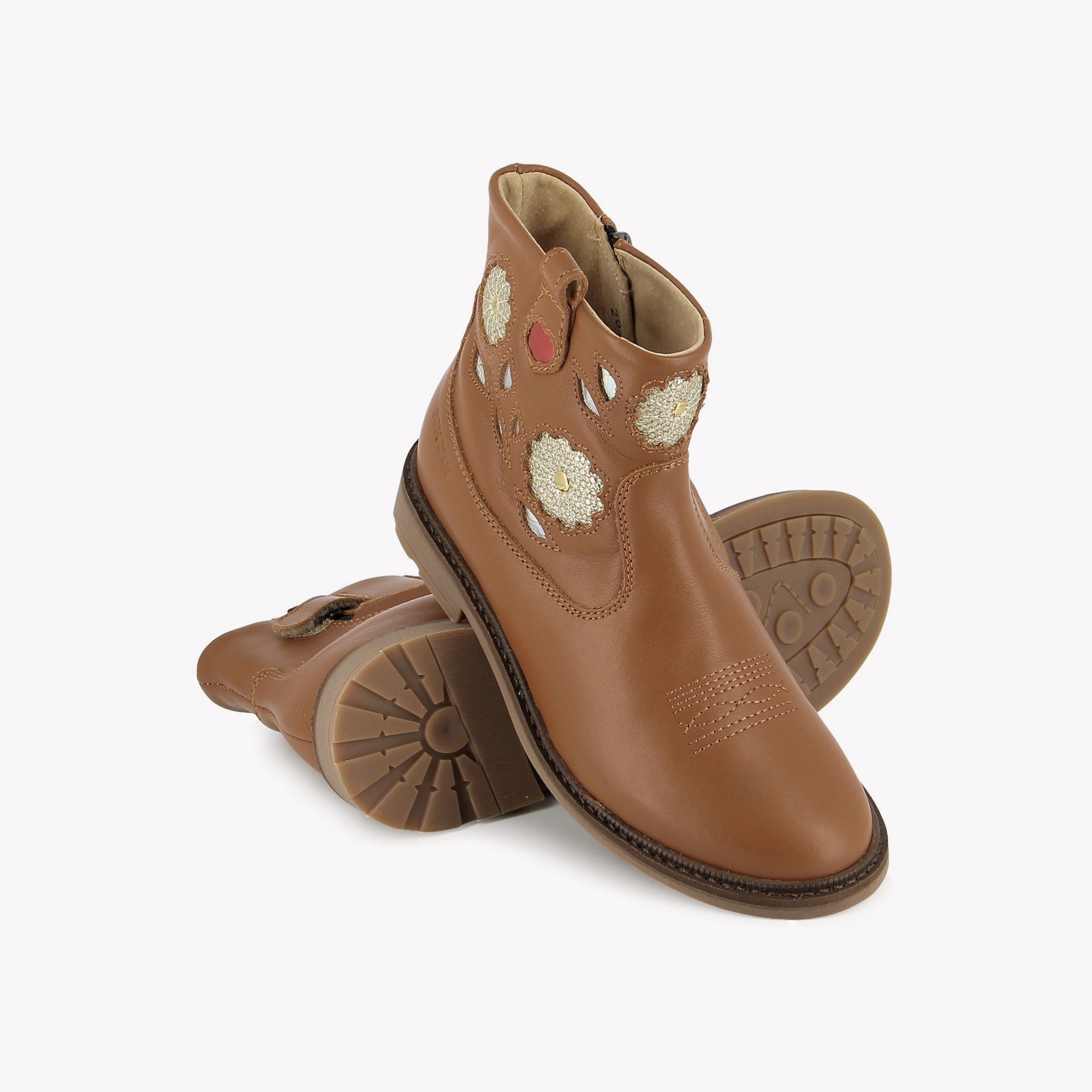 Deze soepele bootie van camelkleurig leer heeft het kenmerkende bloemmotief van Pom d'Api. Ze zijn licht en flexibel en bieden uitstekende ondersteuning voor de voet. Het hoge leren bovenwerk biedt optimale ondersteuning voor de enkel en wreef, terwijl de ritssluiting aan de binnenkant ze gemakkelijk aan te trekken maakt. Deze laarzen zijn verkrijgbaar in een reeks trendy kleuren en combineren comfort en stijl.