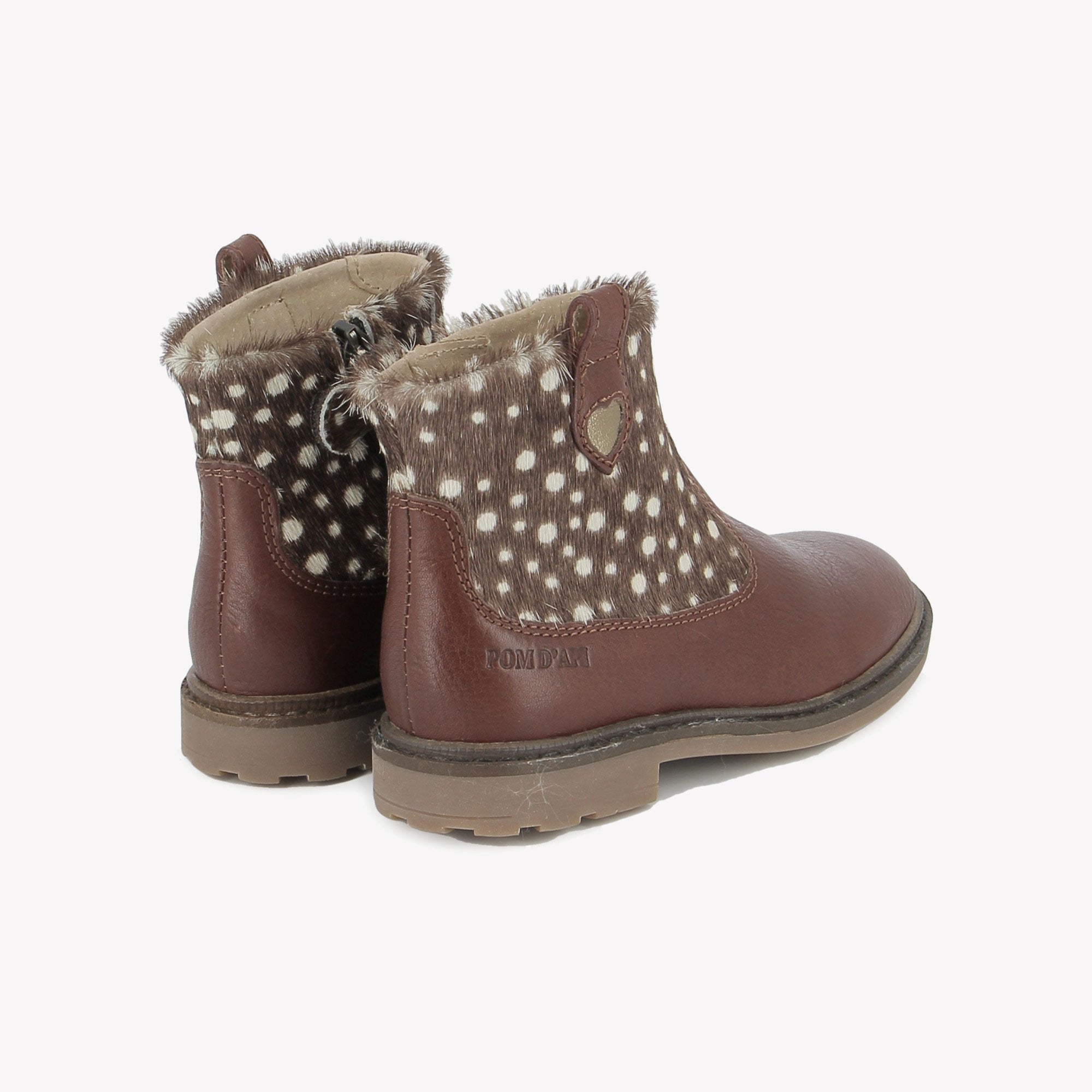 Deze enkellaars van glad bruin leer heeft een fantasievolle inzet van bontleer. Ze zijn licht en flexibel en bieden uitstekende ondersteuning voor de voet.