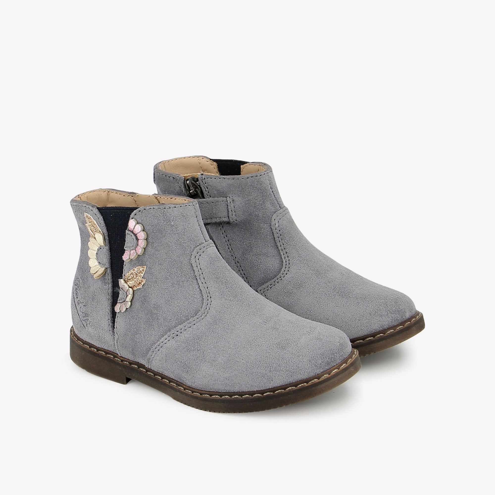 Deze paarse bootie van suèdeleer heeft bloemeninzetten, een iconische Pom d'Api-handtekening. Hij is gemakkelijk aan te trekken dankzij de ritssluiting aan de binnenkant en biedt goede ondersteuning voor de voet terwijl hij veel bewegingsvrijheid biedt.