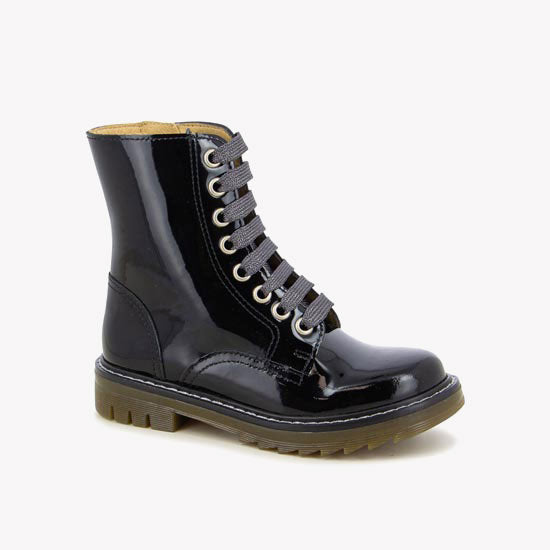 Deze enkellaars van lakleer is geïnspireerd op de ranger stijl en heeft een vetersluiting in combinatie met een ritssluiting aan de binnenkant om hem gemakkelijk aan te trekken.