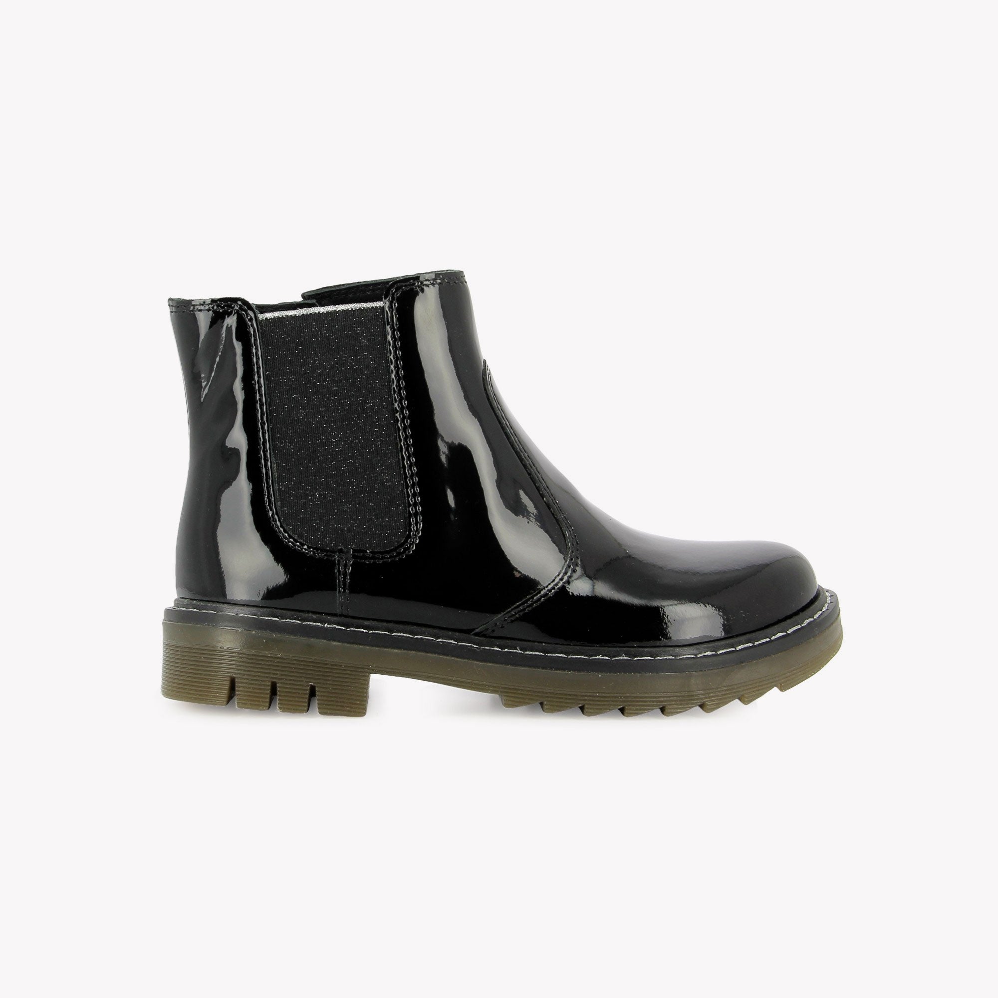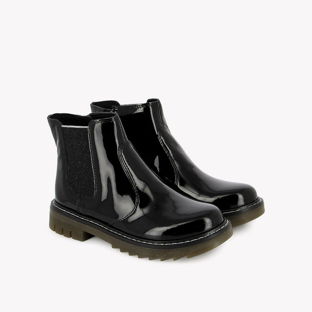 Dit zwarte enkellaarsje van lakleer is gemakkelijk aan te trekken dankzij het elastiek en de ritssluiting aan de binnenkant.