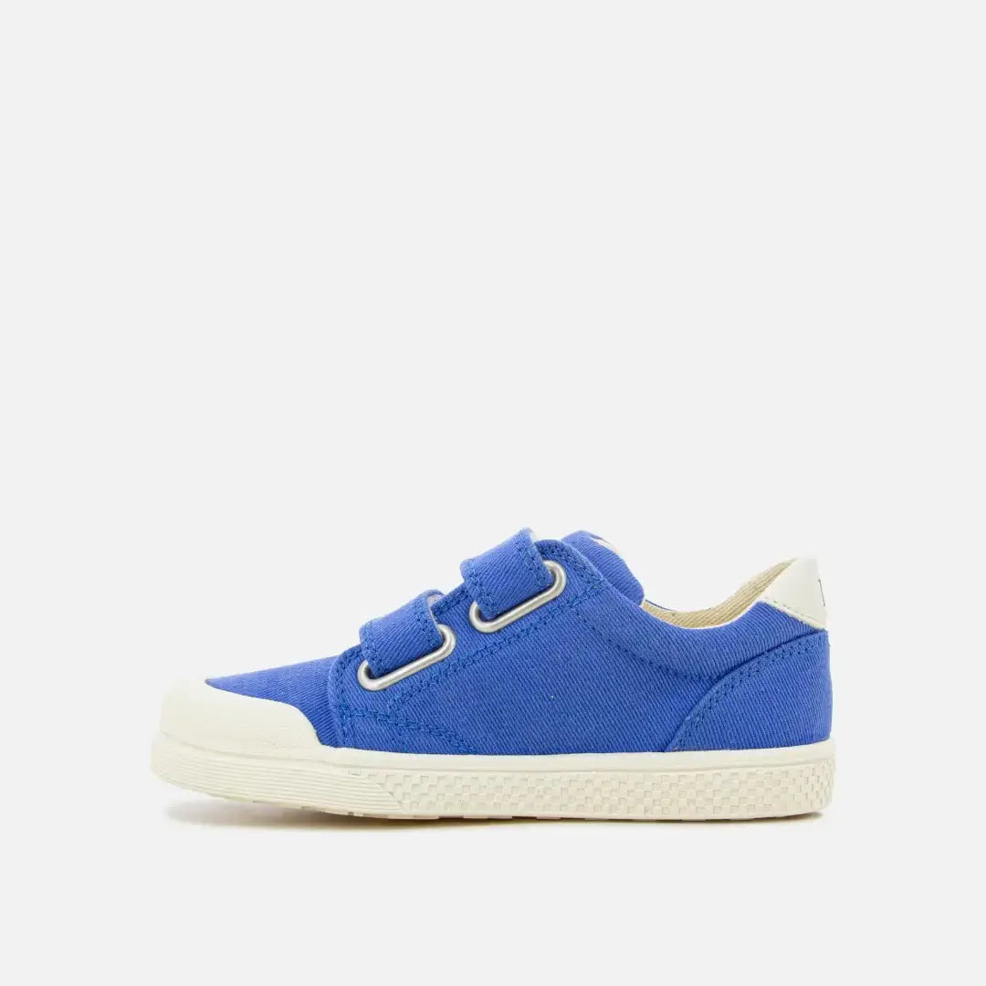 Deze kindersneaker is verkrijgbaar in een blauwe canvasversie.