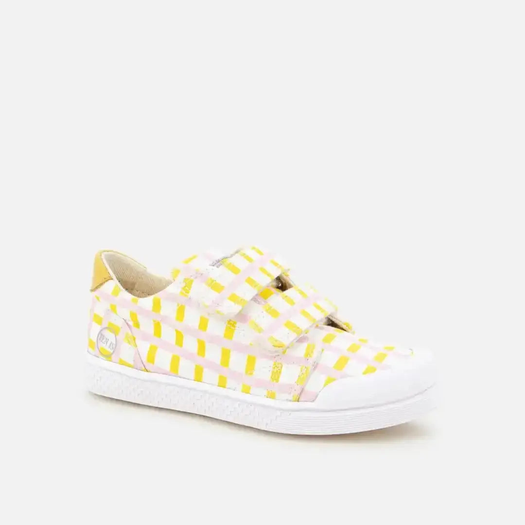 Deze kindertrainer wordt geleverd in een geel met roze bedrukte canvas versie. Hij is gemaakt van kwaliteitsmaterialen om de ontwikkeling van de voet te ondersteunen en is gemakkelijk aan te trekken dankzij de klittenbandsluiting.