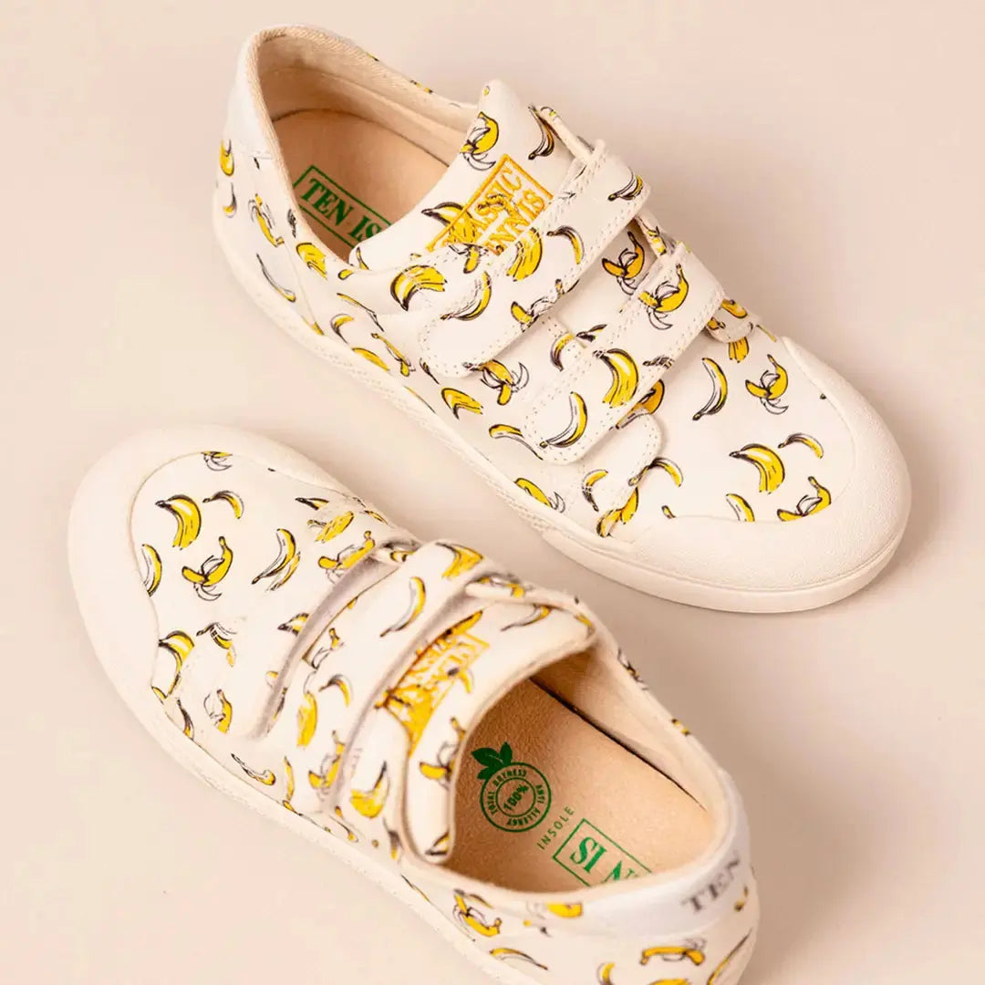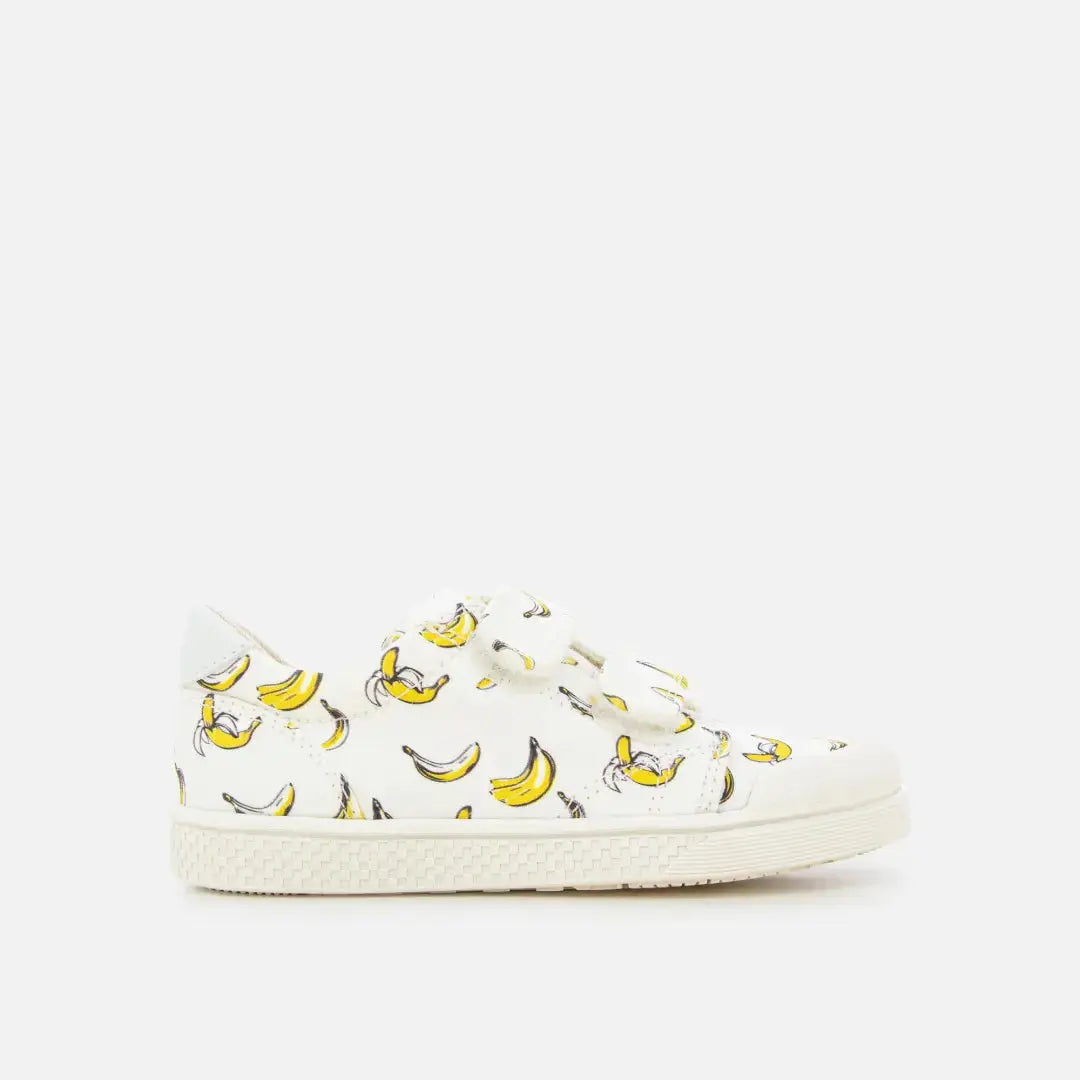 Deze kindertrainer is gemaakt van canvas met een bananenpatroon. Hij is gemaakt van kwaliteitsmaterialen om de ontwikkeling van de voet te ondersteunen en is gemakkelijk aan te trekken dankzij de klittenbandsluiting.