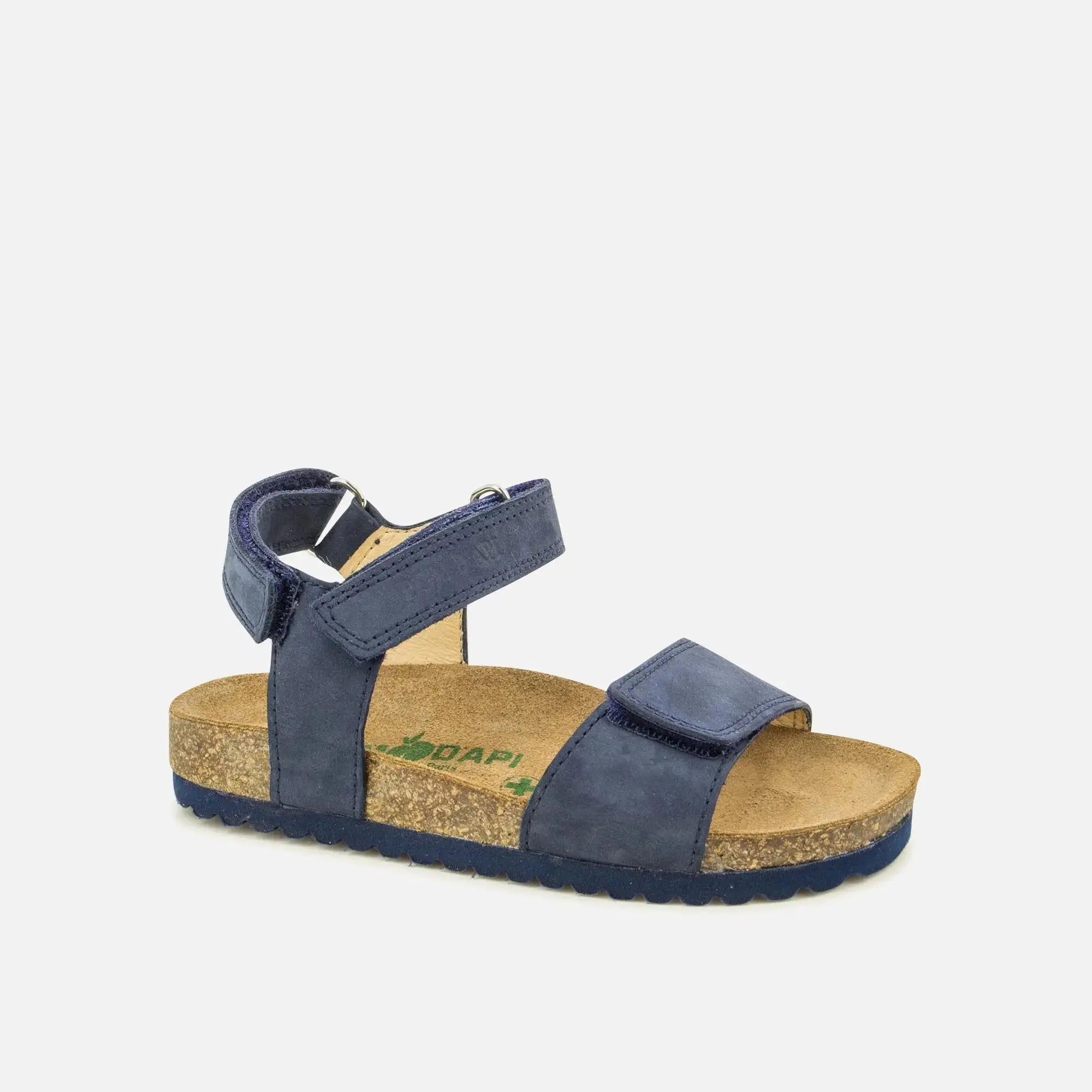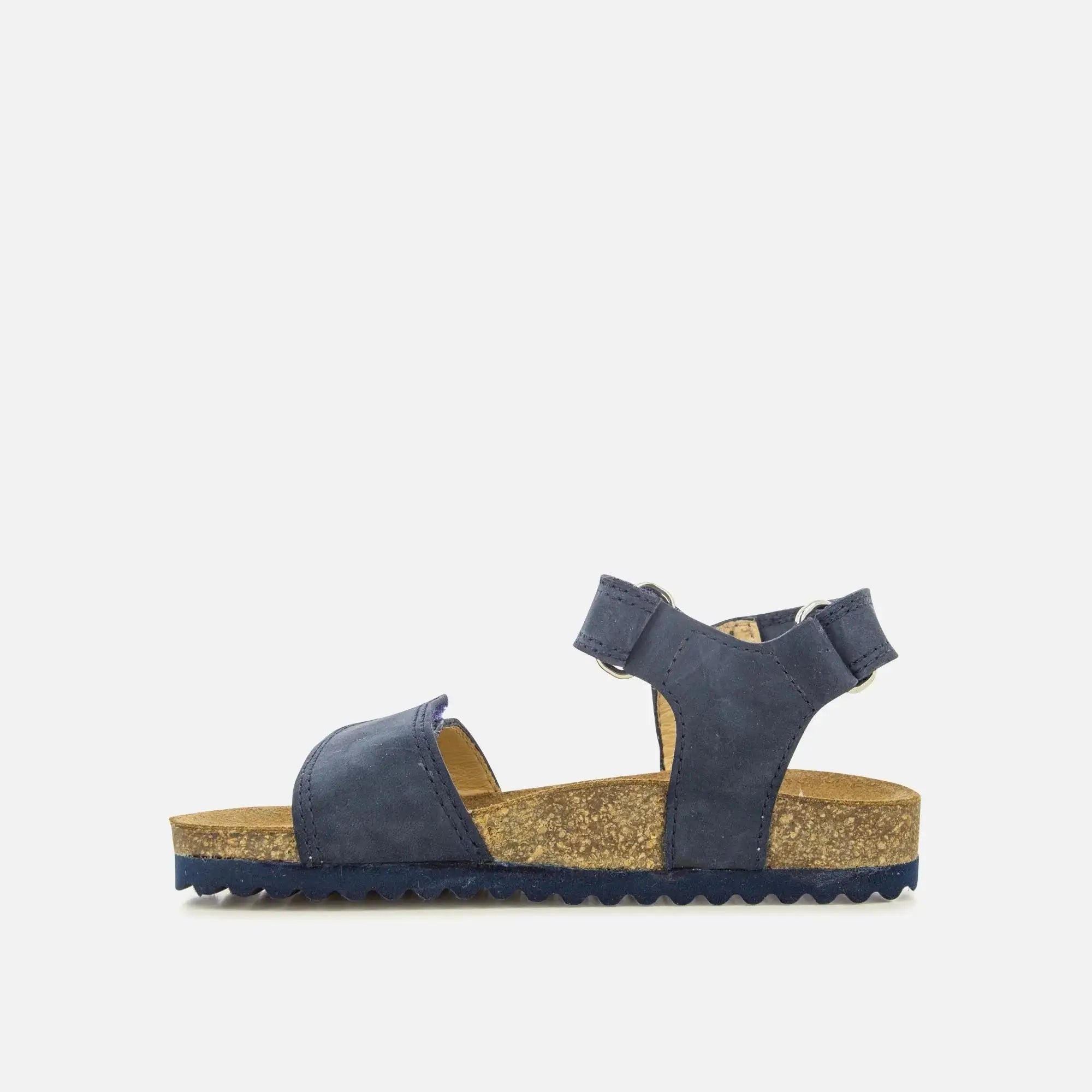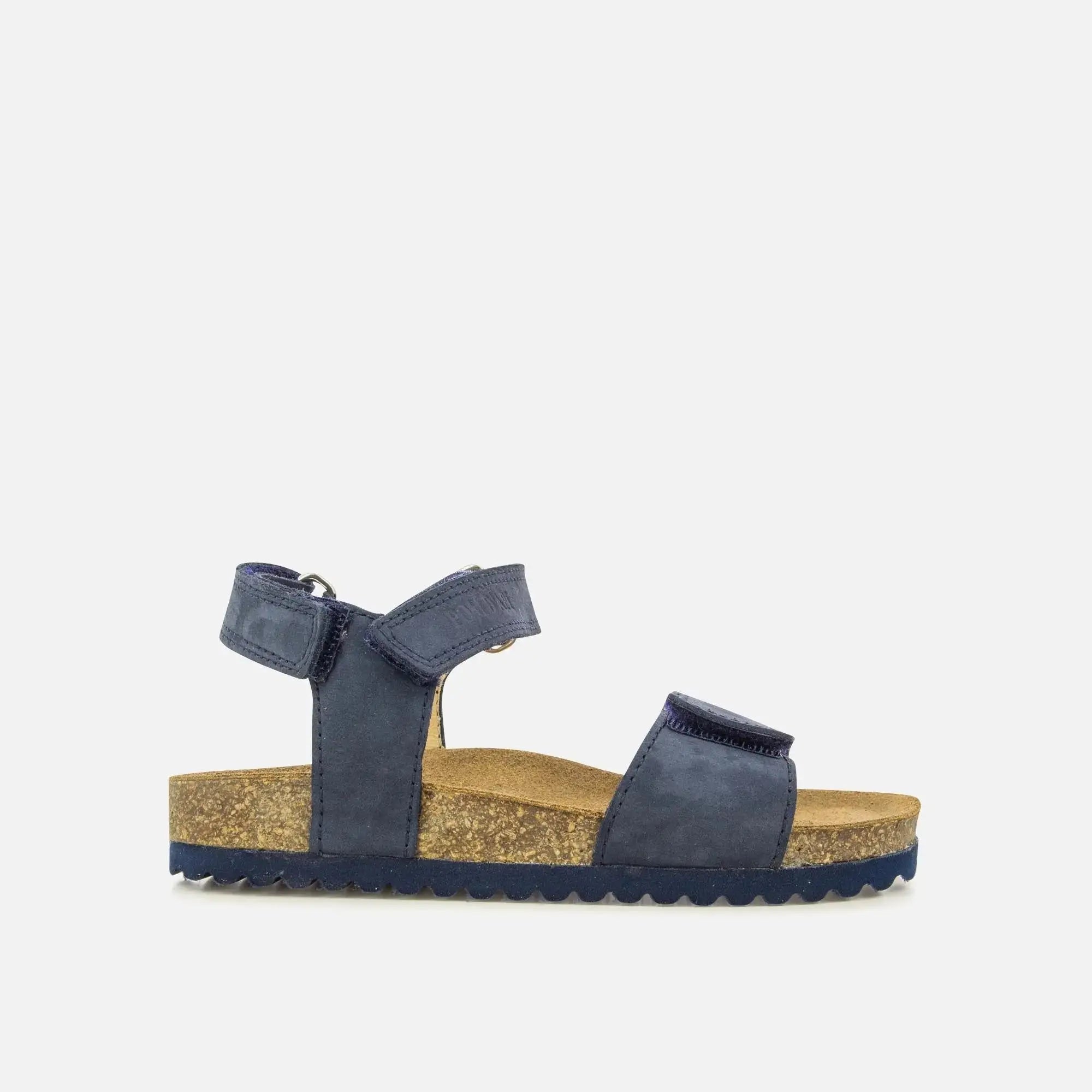 Groot Bi Easy est une sandale compensée pour enfant présentée ici en cuir bleu marine. Sa semelle confortable contient du liège. Elle se chausse facilement grâce à ses deux bandes auto-agrippantes sur la cheville et l'avant du pied.