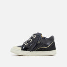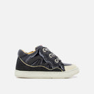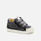 Cette basket premiers-pas est présentée dans une version en cuir lisse vernis noir. Cette chaussure souple et légère est conçue avec des matériaux de qualité pour le bon développement du pied . Elle s'ajuste facilement à la cheville et au cou-de-pied grâce à ses lacets et son zip intérieur.