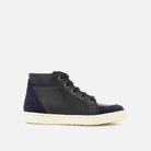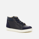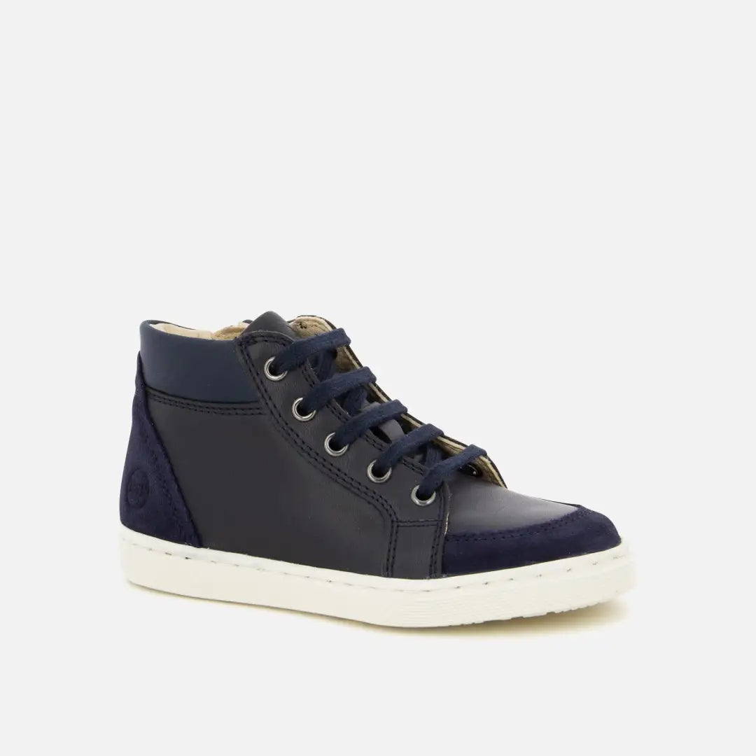 en cuir lisse et en velours bleu marine. Elle est conçue avec des matériaux de qualité pour le bon développement du pied et se chausse facilement grâce à ses lacets et son zip intérieur.