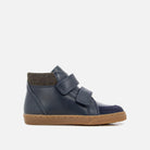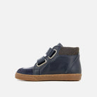 en cuir lisse et en velours bleu marine. Elle est conçue avec des matériaux de qualité pour le bon développement du pied et se chausse facilement grâce à ses scratchs.