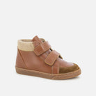 en cuir lisse et en velours camel. Elle est conçue avec des matériaux de qualité pour le bon développement du pied et se chausse facilement grâce à ses scratchs.