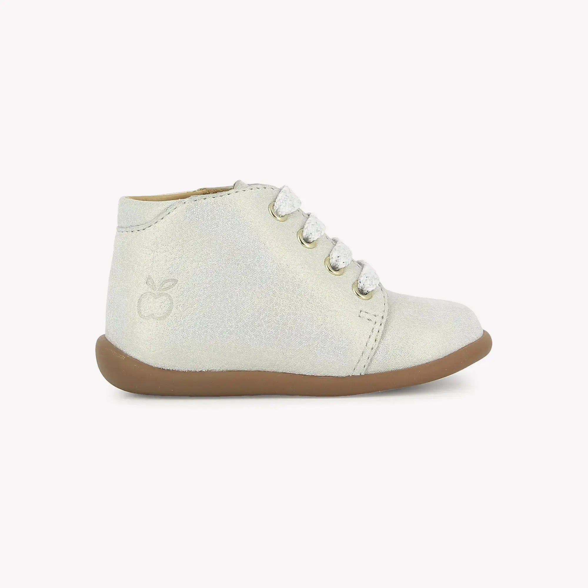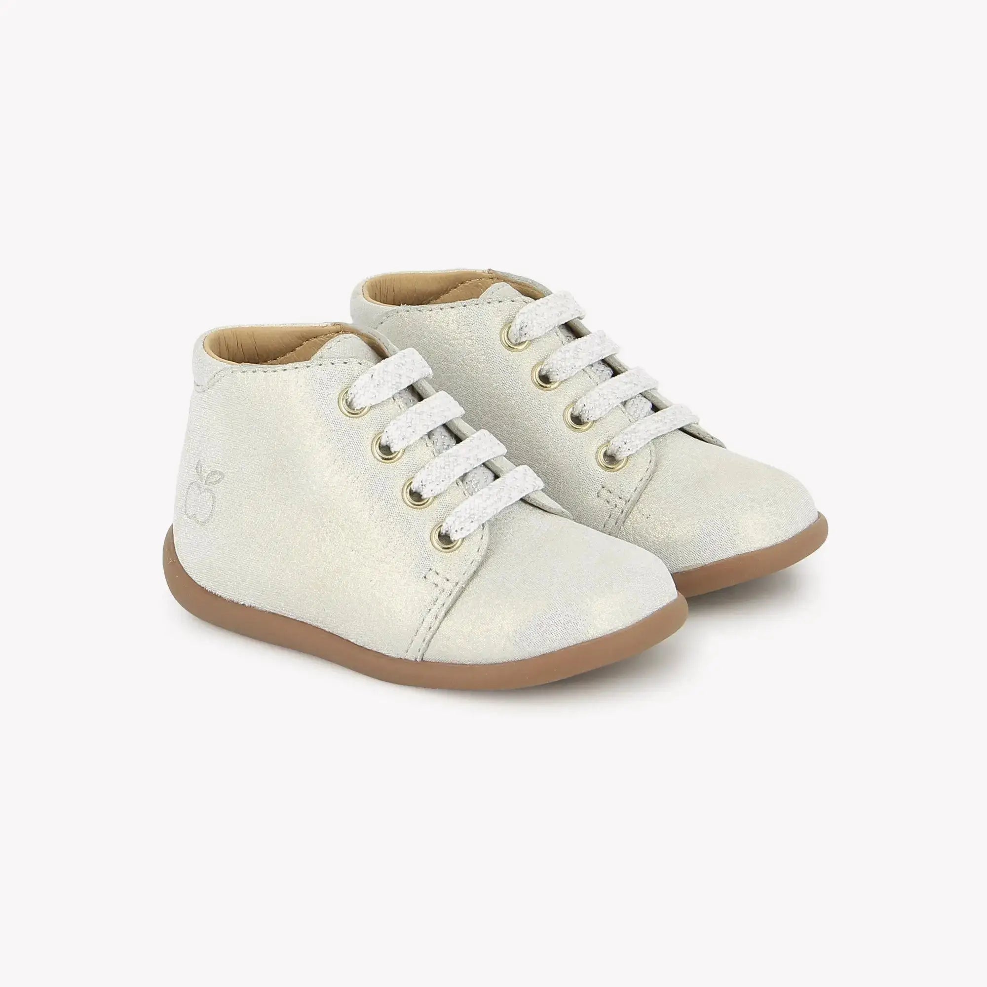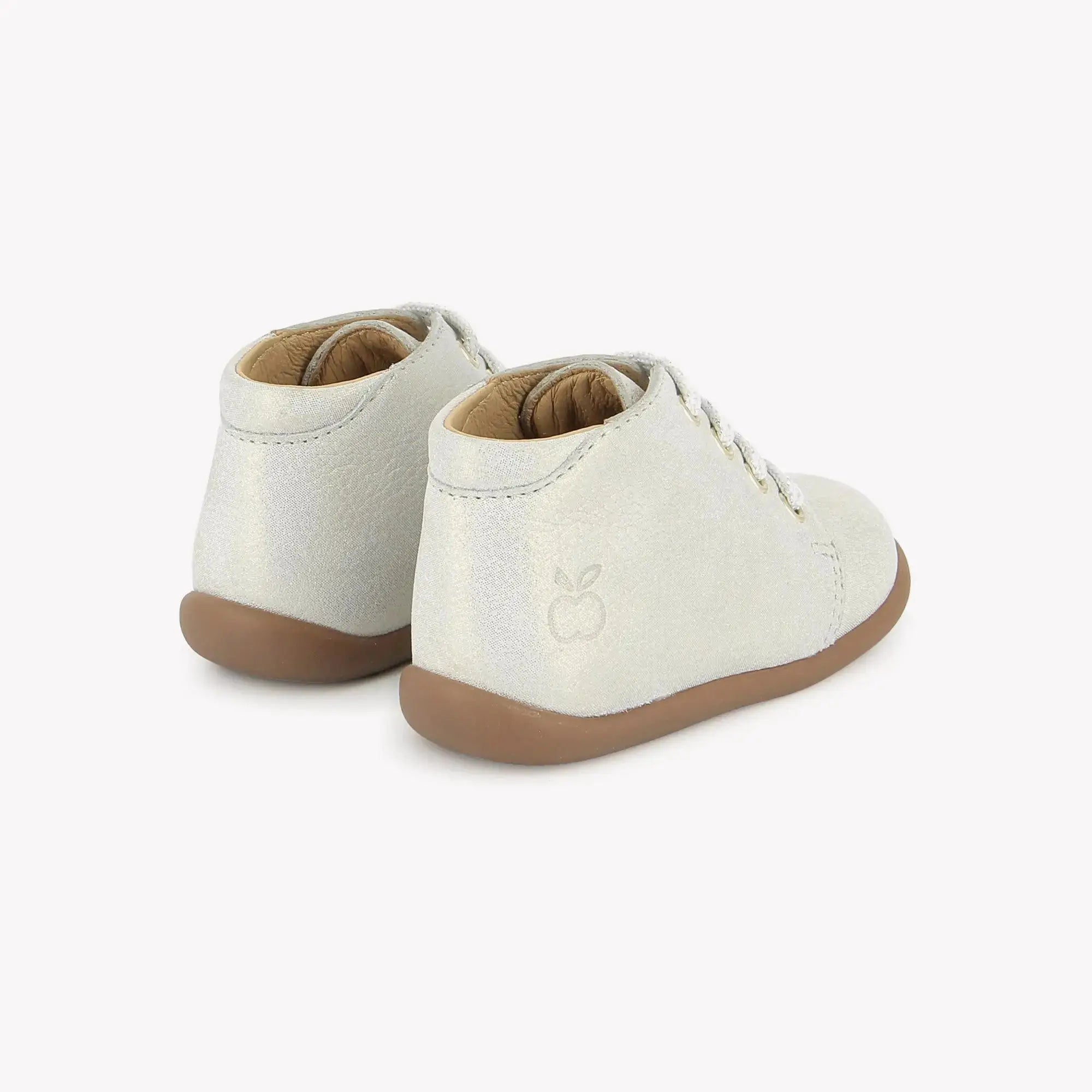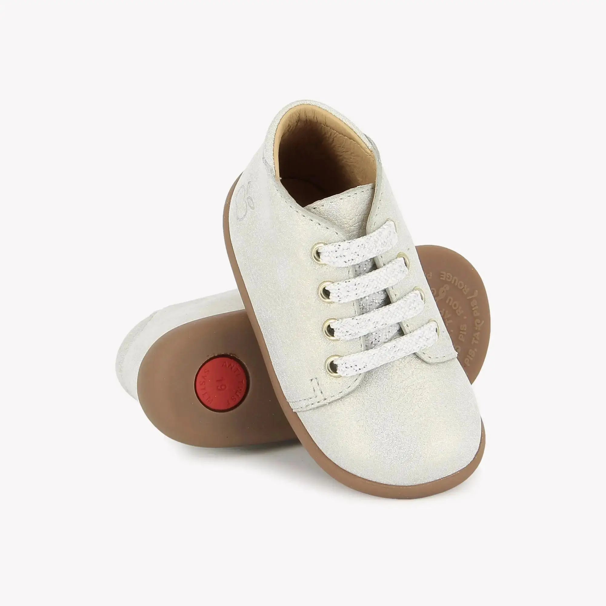 Cette chaussure premiers-pas est équipée d’une semelle souple en caoutchouc antidérapant et d’un cambrion Anti-Twist© breveté, intégré dans la semelle au niveau du talon. Ce système prévient les torsions de la cheville, tout en conservant une grande souplesse à l’avant du pied. Confectionnée à partir d'un cuir premium, soigneusement sélectionné, elle allie élégance et technicité, pour accompagner les premiers pas. Le col et la languette sont matelassés pour davantage de confort. La fermeture à lacets assure un ajustement précis, tandis que la large ouverture facilite l’enfilage.