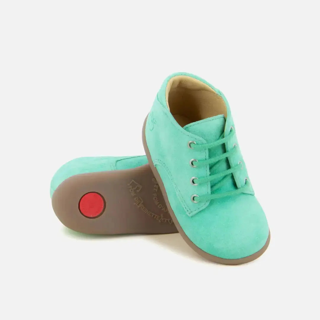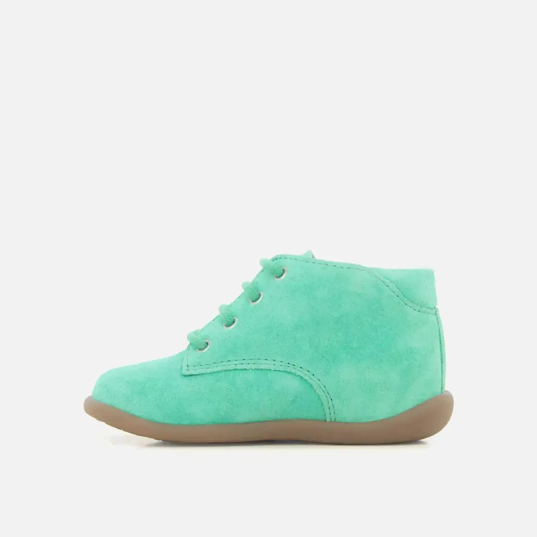 Cette chaussure premiers-pas à lacets pour enfants est présentée dans une version en cuir velours vert. Légère et dotée d'une semelle en caoutchouc, cette chaussure est conçue avec des matériaux de qualité pour le bon développement du pied. Un renfort Anti-Twist placé à l'arrière de la chaussure assure un maintien et une stabilité optimale, tout en offrant une souplesse à l'avant du pied.