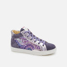 Cette basket montante pour enfants est présentée dans une version bi-matière en cuir velours violet et textile pailleté. Légère et dotée d’une semelle en caoutchouc, cette chaussure est conçue avec des matériaux de qualité pour le bon développement du pied et elle s’ajuste facilement à la cheville et au cou-de-pied grâce à ses lacets et son zip intérieur. La doublure et la semelle intérieure sont en microfibre, fabriquée à partir de maïs.