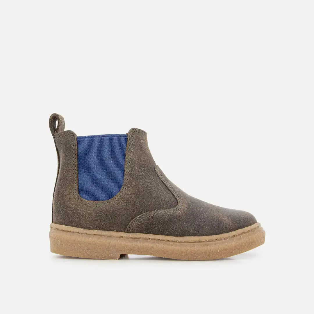 Cette bottine pour enfants est présentée dans une version en cuir velours taupe, avec un élastique bleu. Elle est légère et souple et est conçue avec des matériaux de qualité pour le bon développement du pied. Cette chaussure possède une tige haute pour un maintien optimal de la cheville et du cou-de-pied et elle se chausse facilement grâce à son élastique.